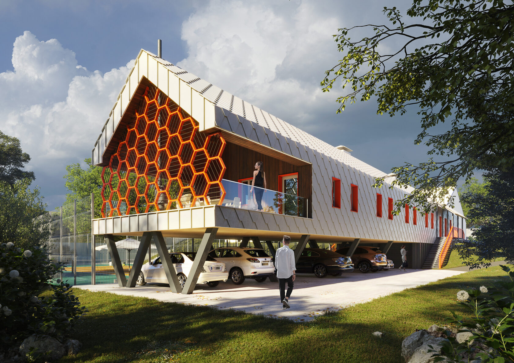 Догадливые читатели конечно же уже поняли, что победил вариант «Многоножка». С этого момента началась адаптация концепта под реальность. Появилось дополнительное здание / летняя беседка. Предполагалось сделать ее более декоративной с хорошим обзором открытого корта. Для этого естественно, ее нужно было «подвесить» над откосом. Даешь еще больше ножек! Но заказчику требовалось более утилитарное здание для хоз нужд и временного проживания персонала. В итоге было принято решение не проектировать это здание, а для упрощения и удешевления заказать его у «Qurama Home».